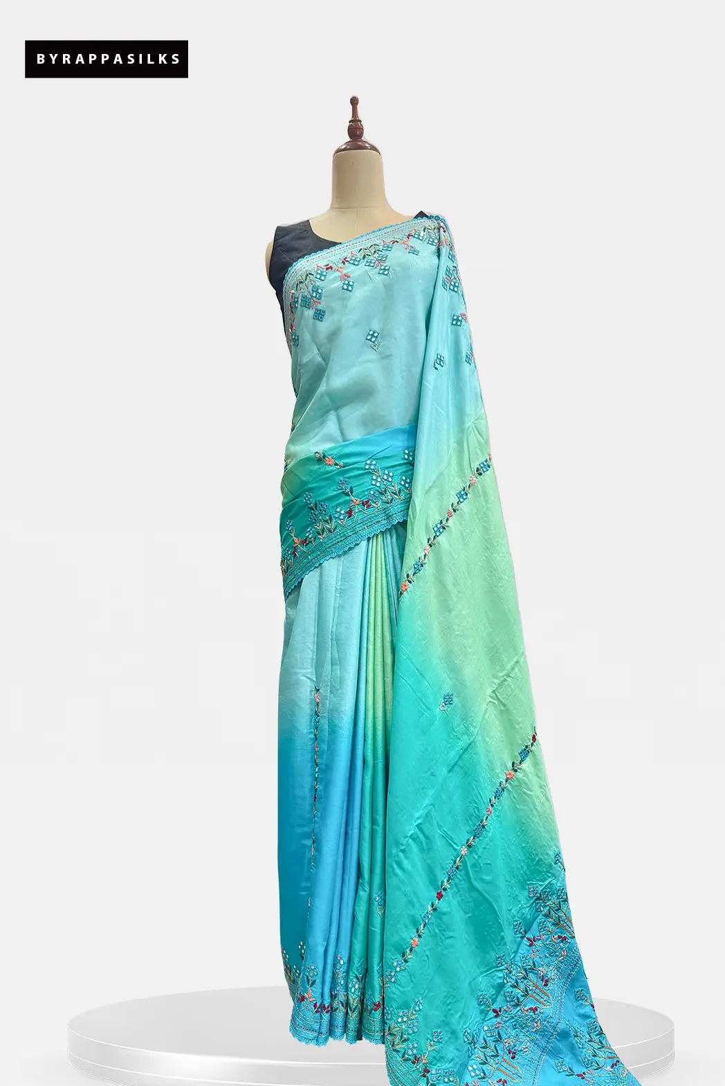 Pure Tussar Saree Seafoam Green & Turquoise Blue Ombre Mirror Work