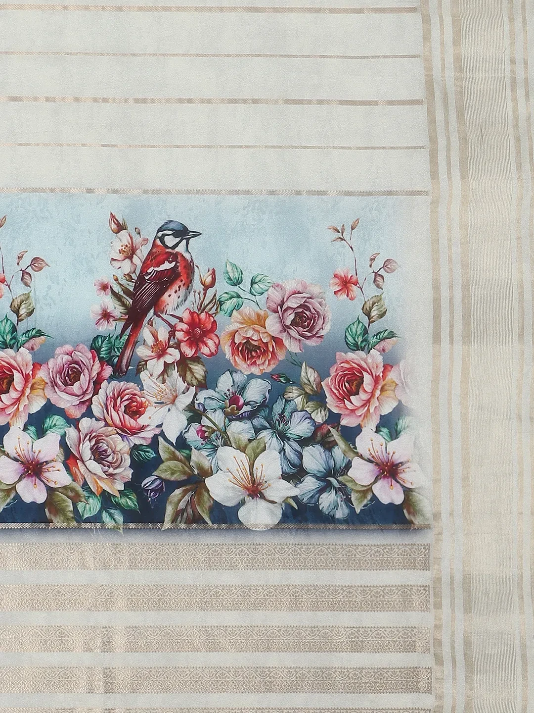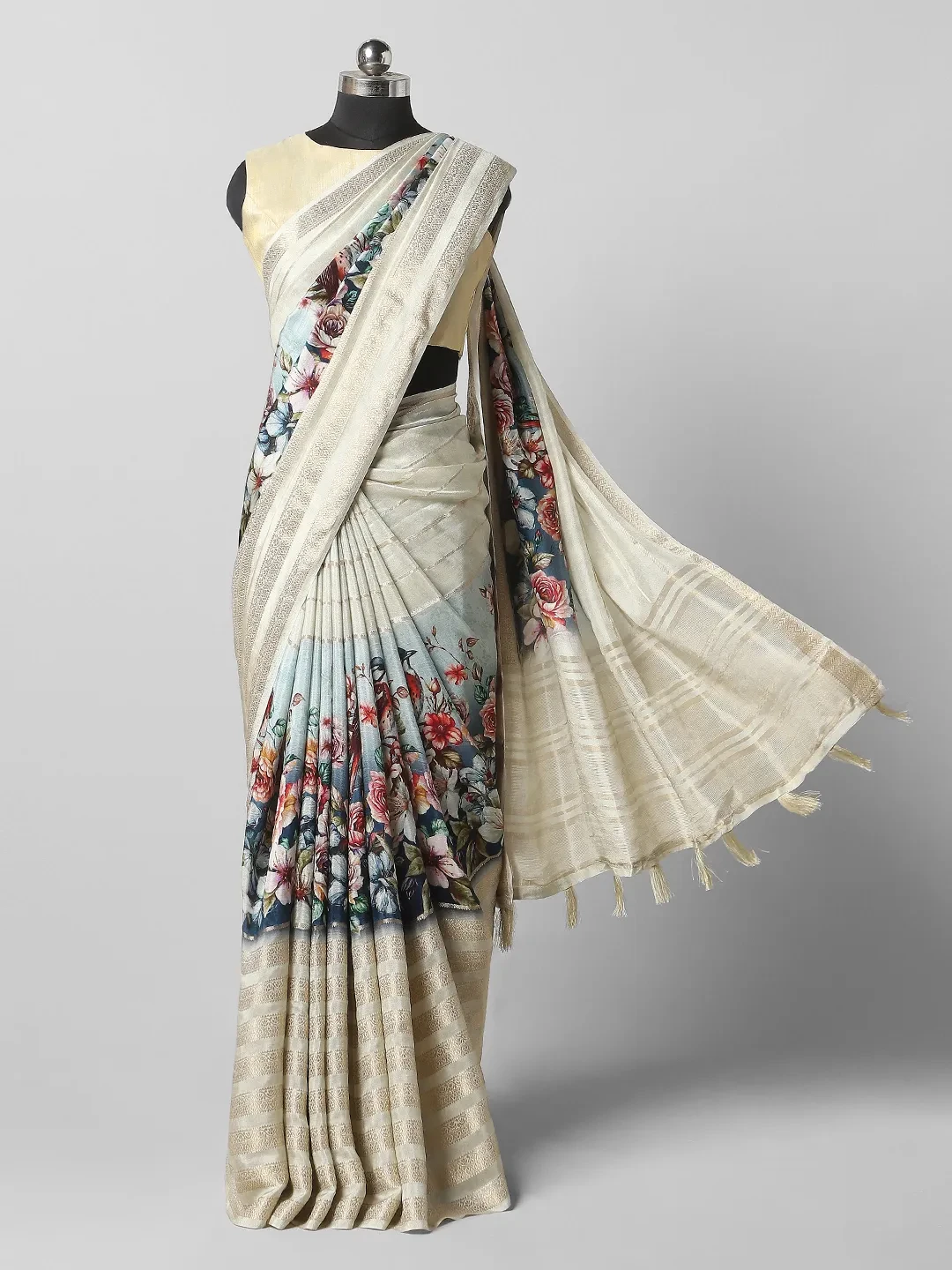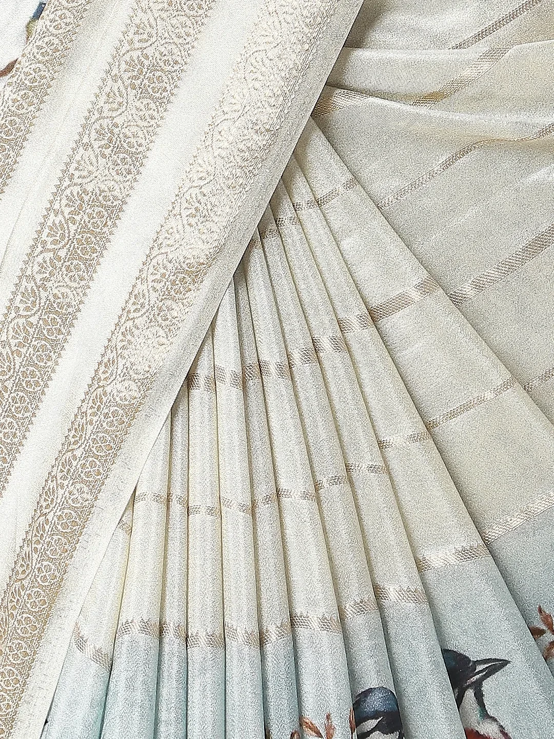 Crape Printed Saree - Cream With Purple Colour QI202186
