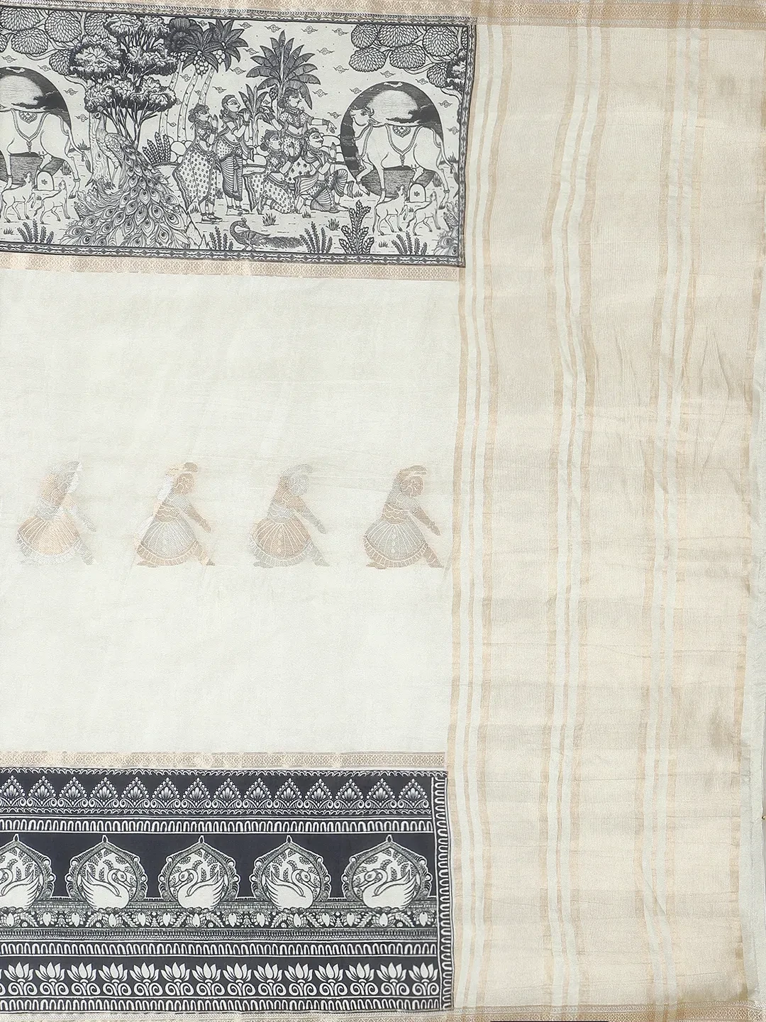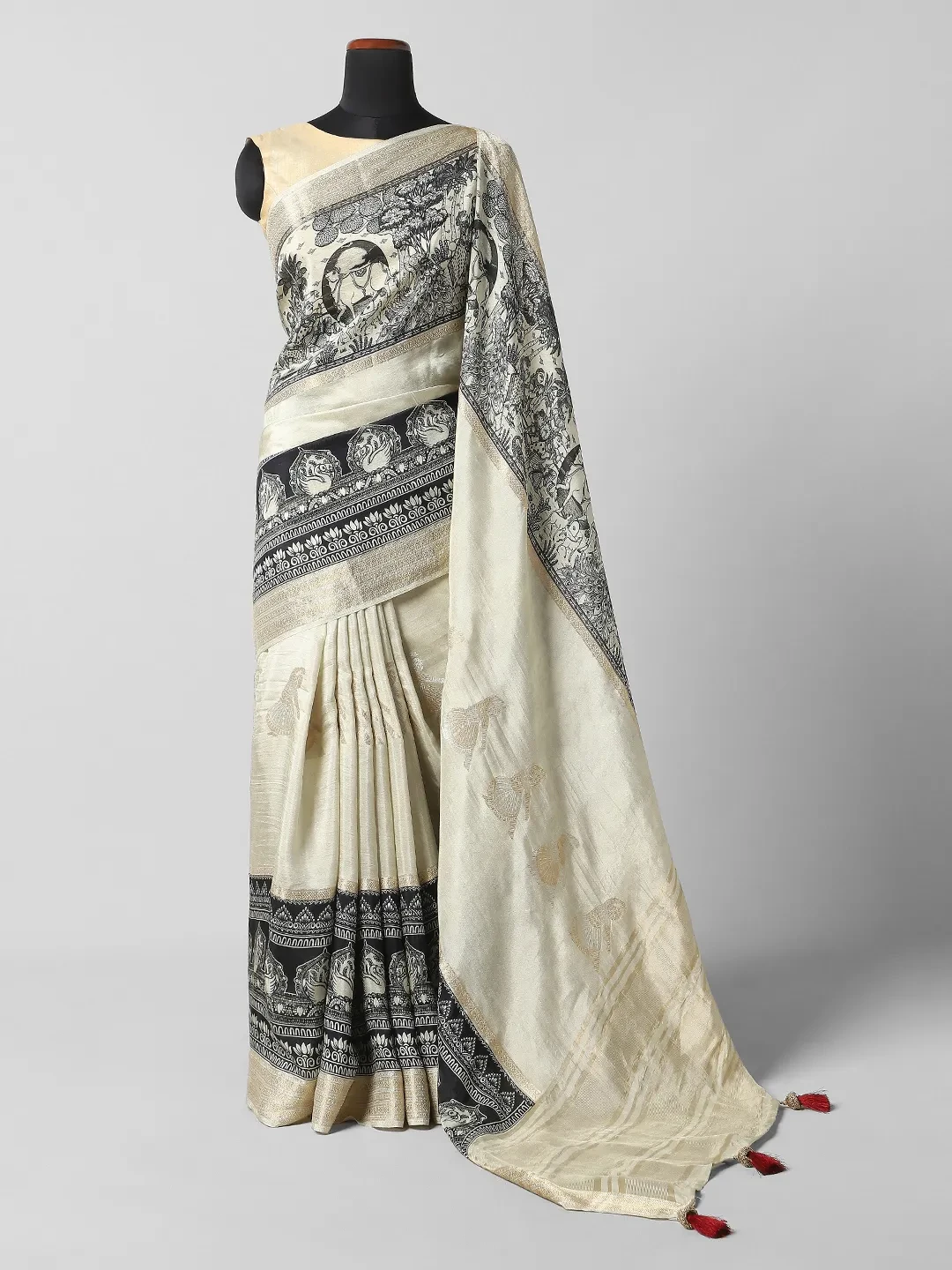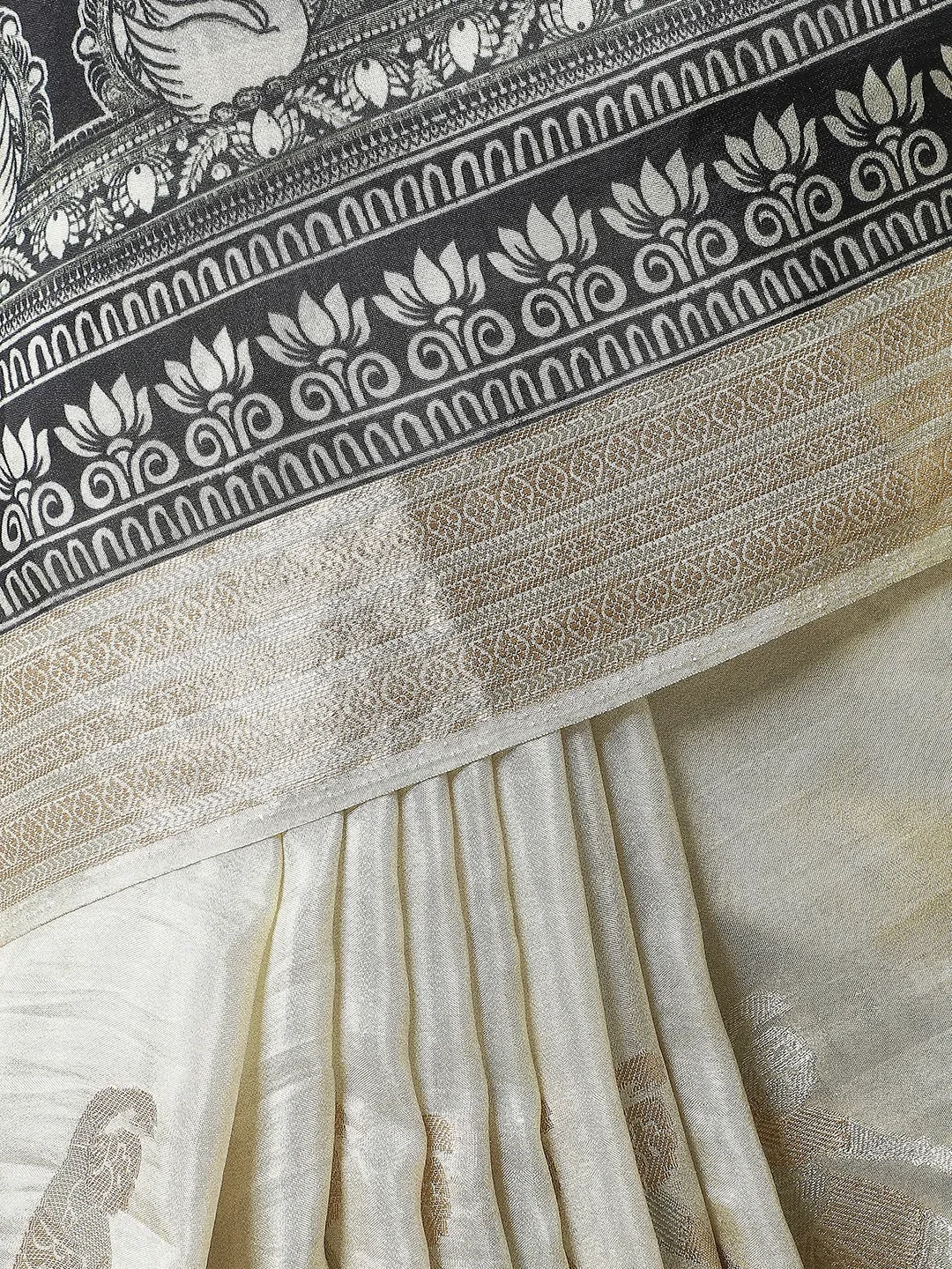 Crape Printed Sarees - Cream With Black Border colour QI202214