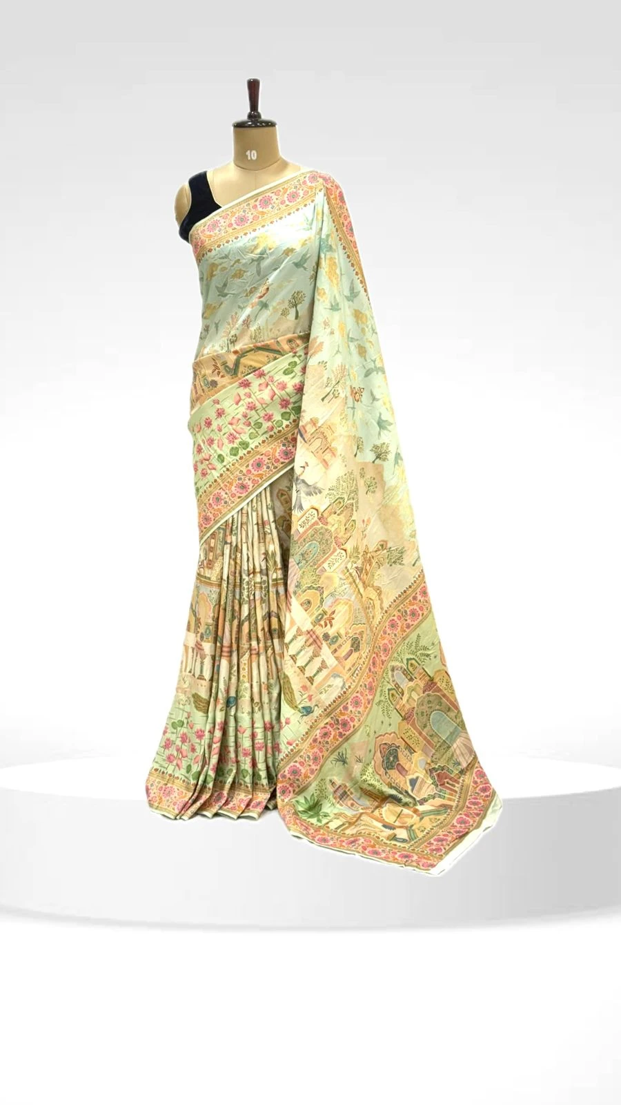 Colour :- Light Blue Printed Silk Saree with Village Theme Design
