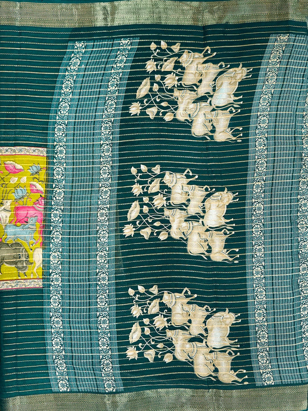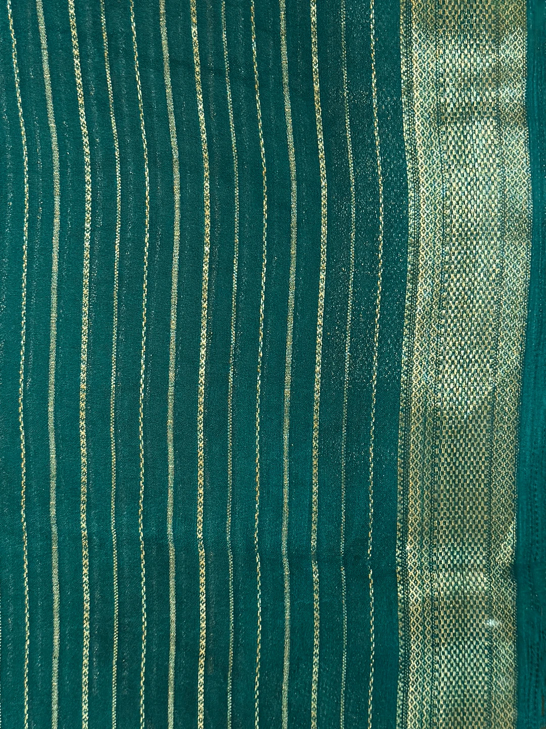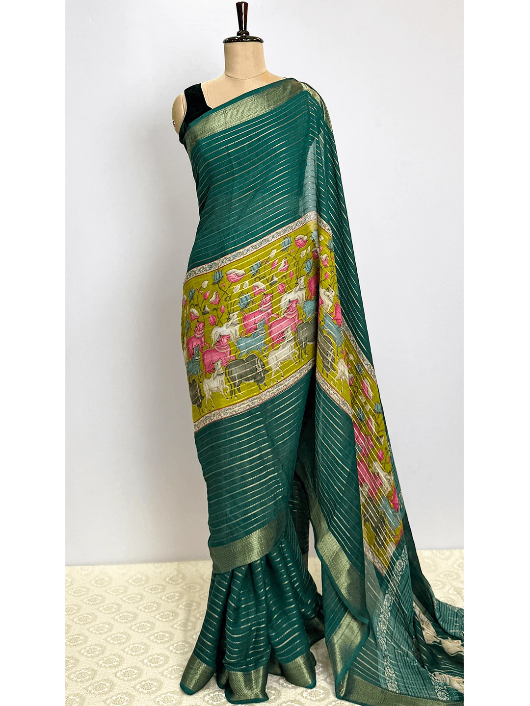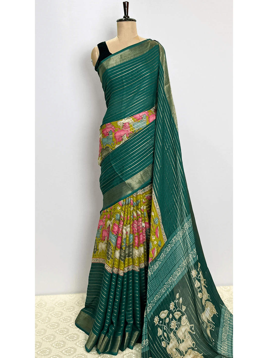 Semi-Crape Stripes & Printed Saree - Dark Green Colour - QS219316