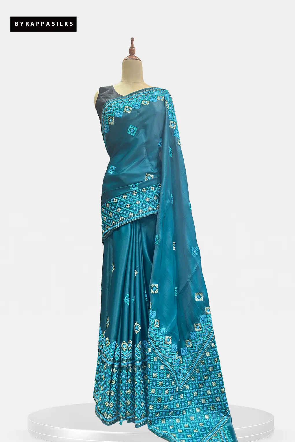Semi Tussar Saree Kutch Work Border Teal Blue QS319198