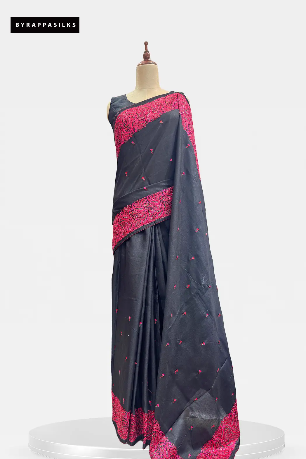 Semi Tussar Saree With Embroidery Border Fuchsia Black Colour₹2006₹2195